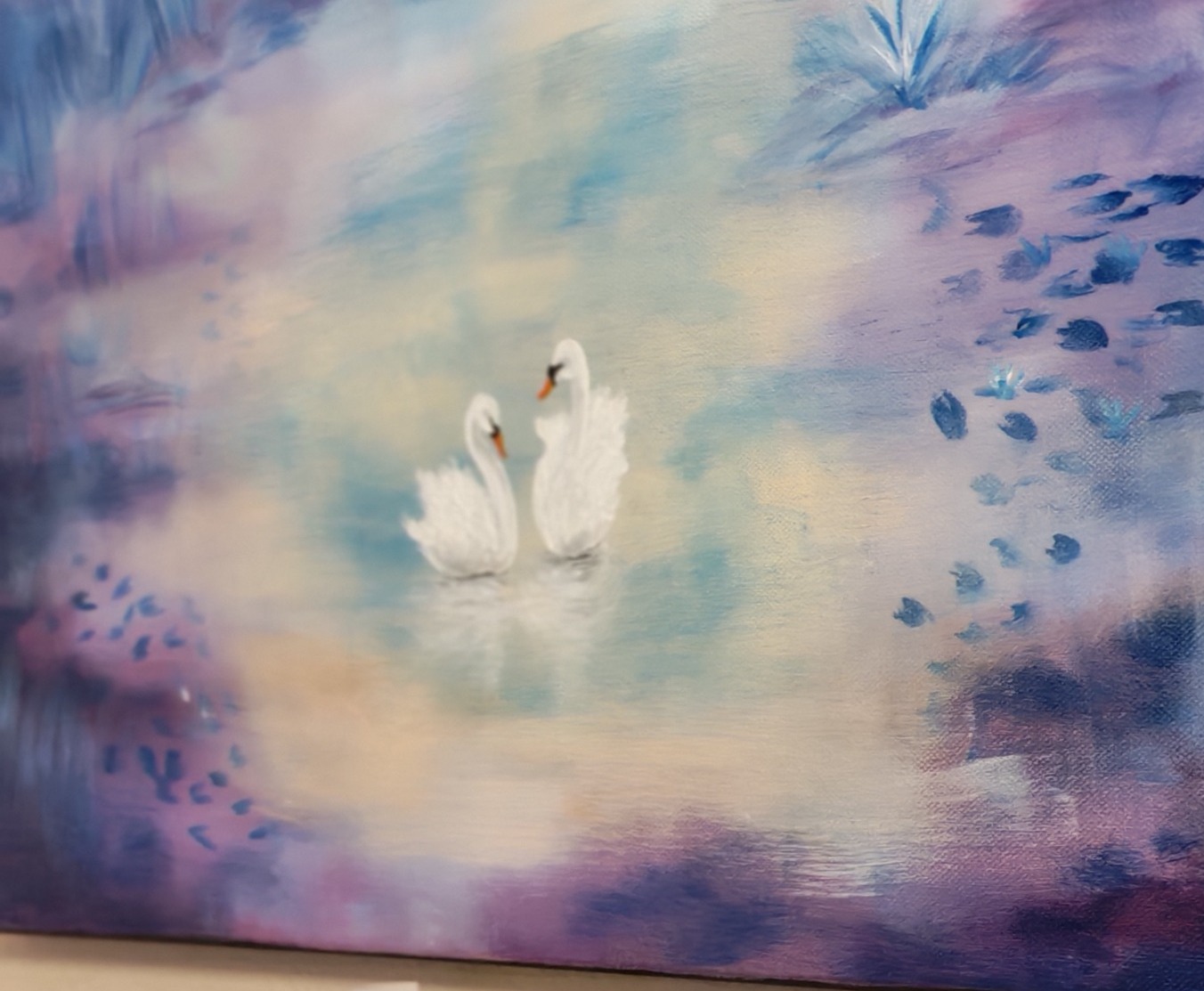 Utuiset sävyt, heijastukset ja lempeä taivas luovat hetken, joka tuntuu ajattomalta ja lohdulliselta. Joutsenten läheisyys kertoo yhteydestä, joka jatkuu silloinkin, kun silmät sulkeutuvat – unissa olemme aina yhdessä.