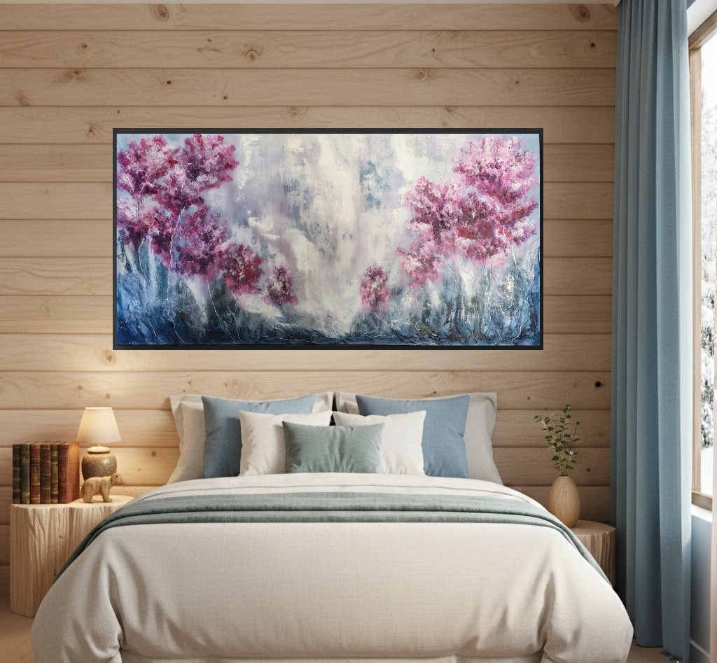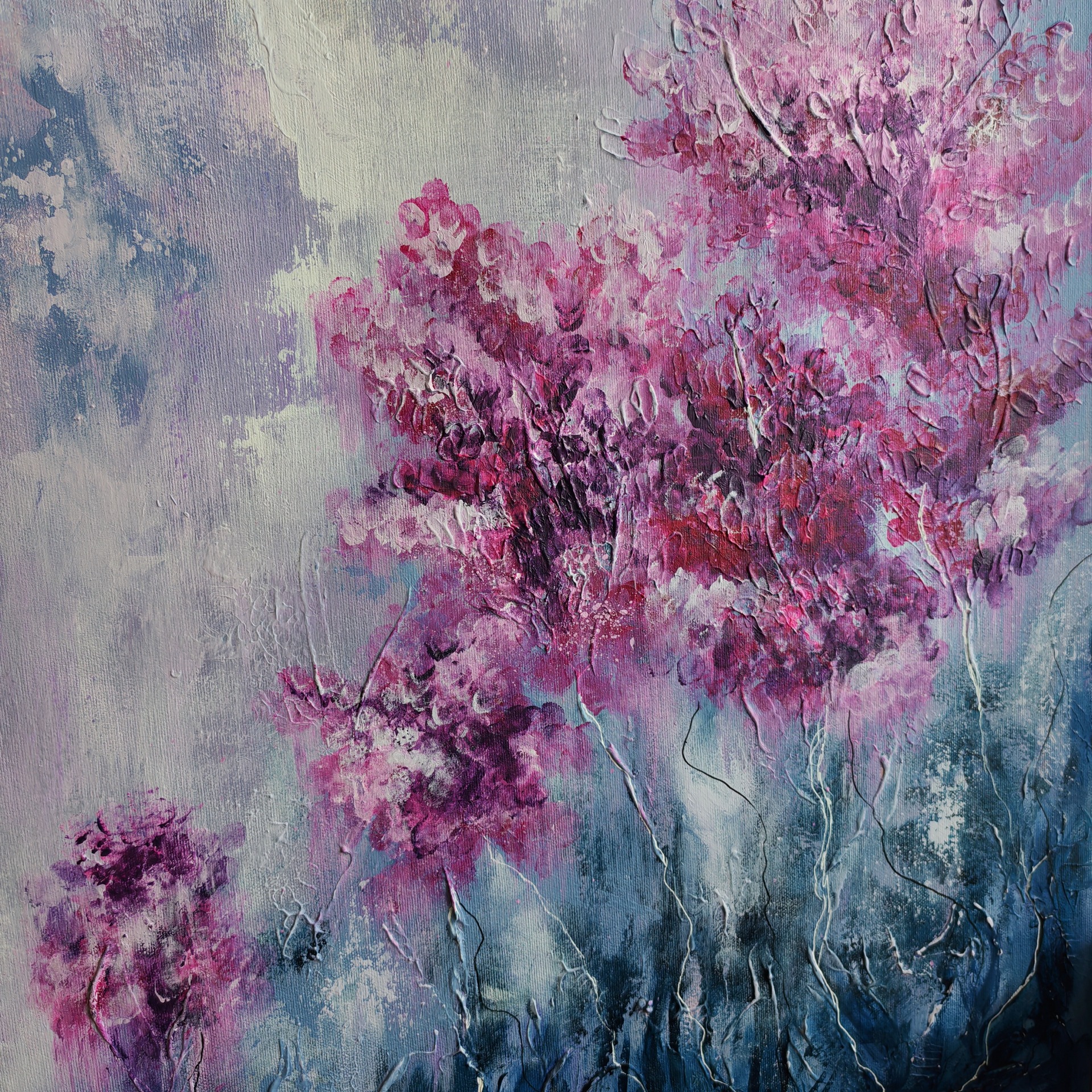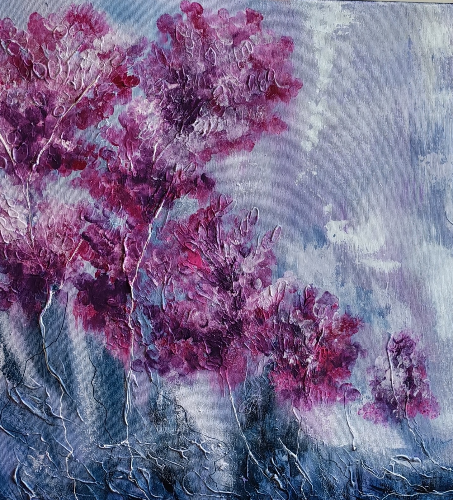En malttanut odottaa kirsikan kukintaa  joten maalasin sen. Teoksessa vahva tekstuuri.