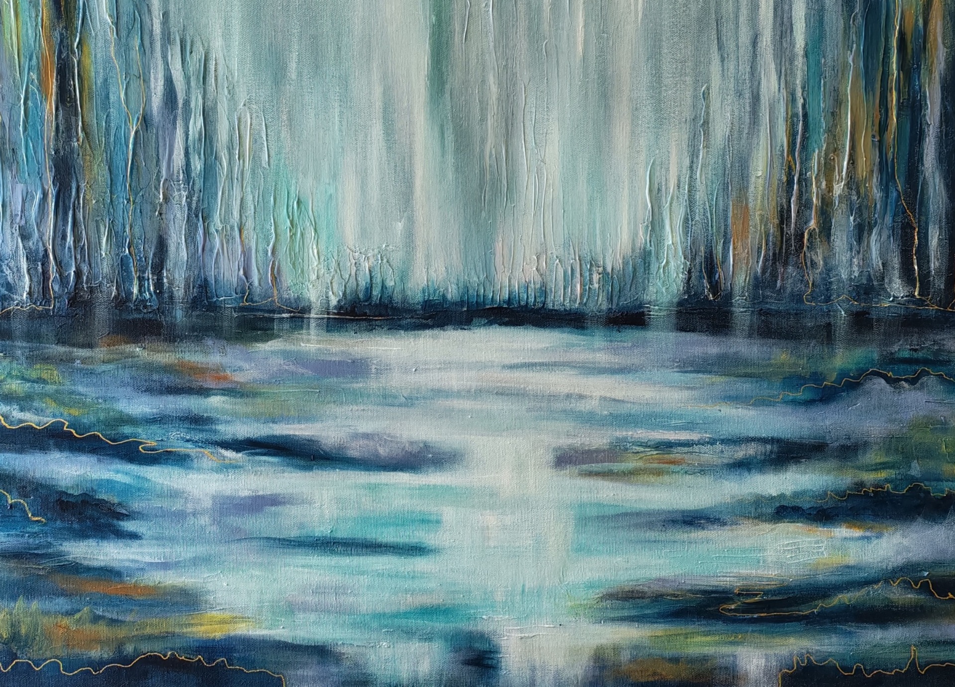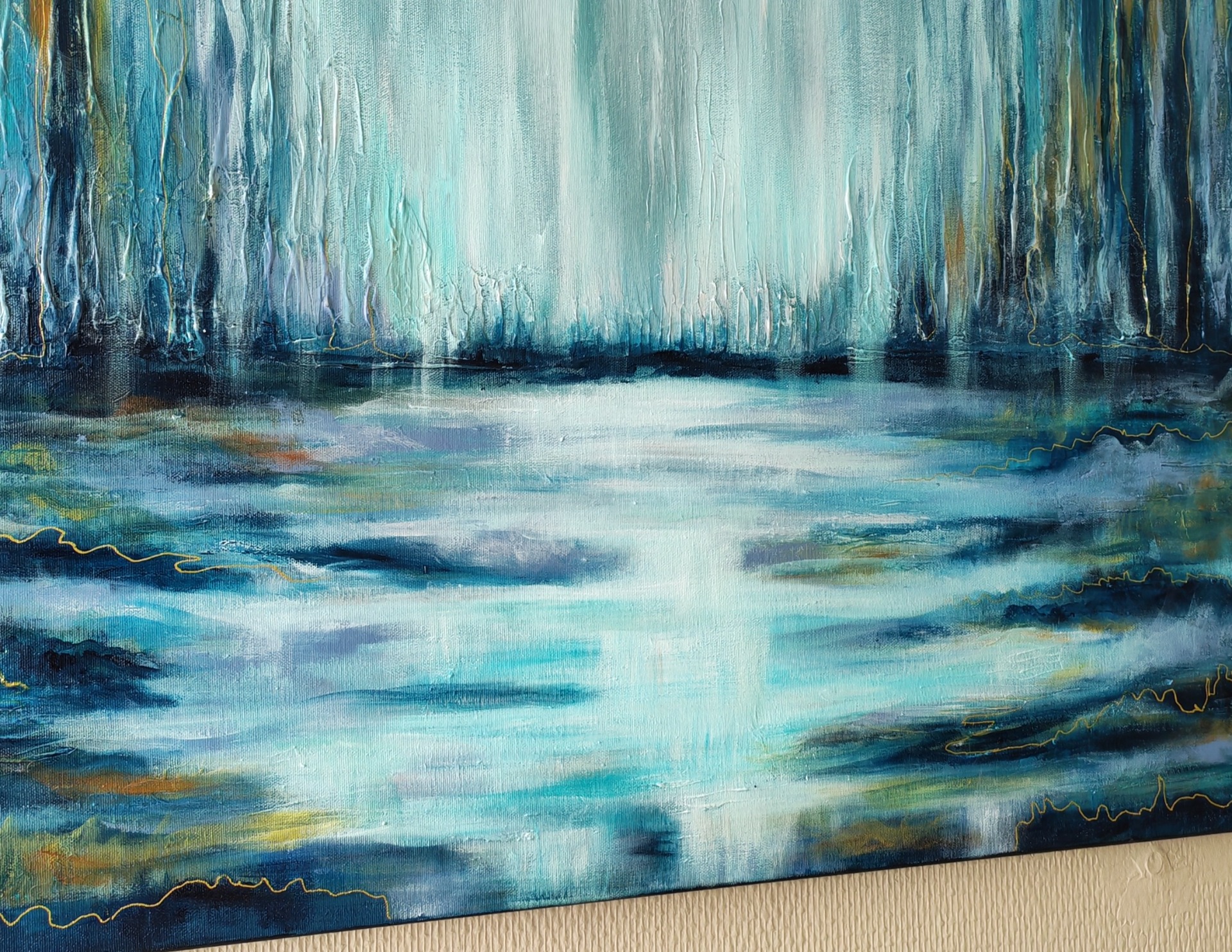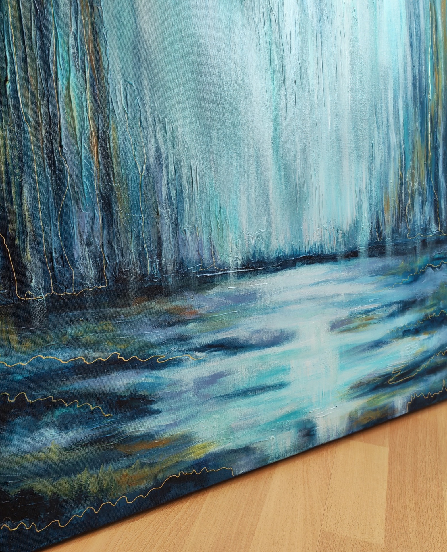 Source of life-teoksessa on kerroksellinen tekstuuri pinta ja rauhoittava värimaailma – sinisen, turkoosin ja utuisen valon sävyt sekä vaaleaa ja turkoosia helmiäistä. Okran ja kullan yksityiskohdat. Teos sopii tilaan, mihin kaivataan veden pysäyttävää rauhoittavaa ominaisuutta.