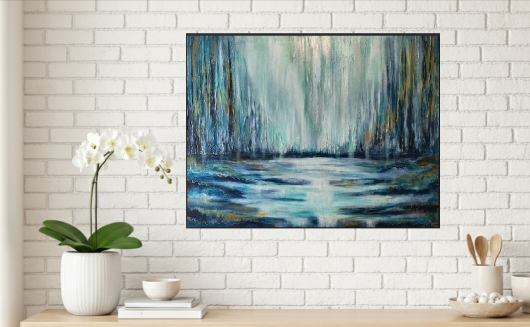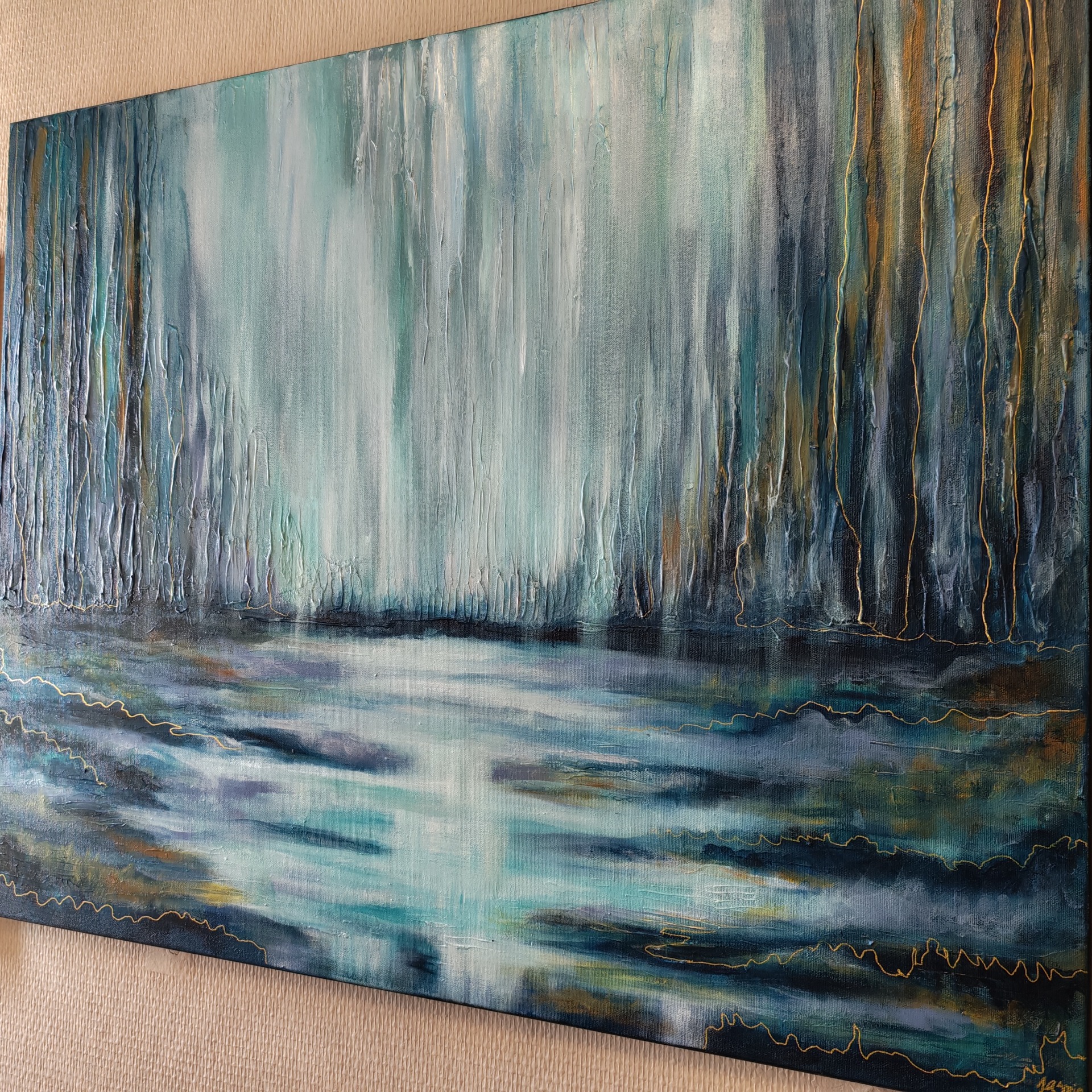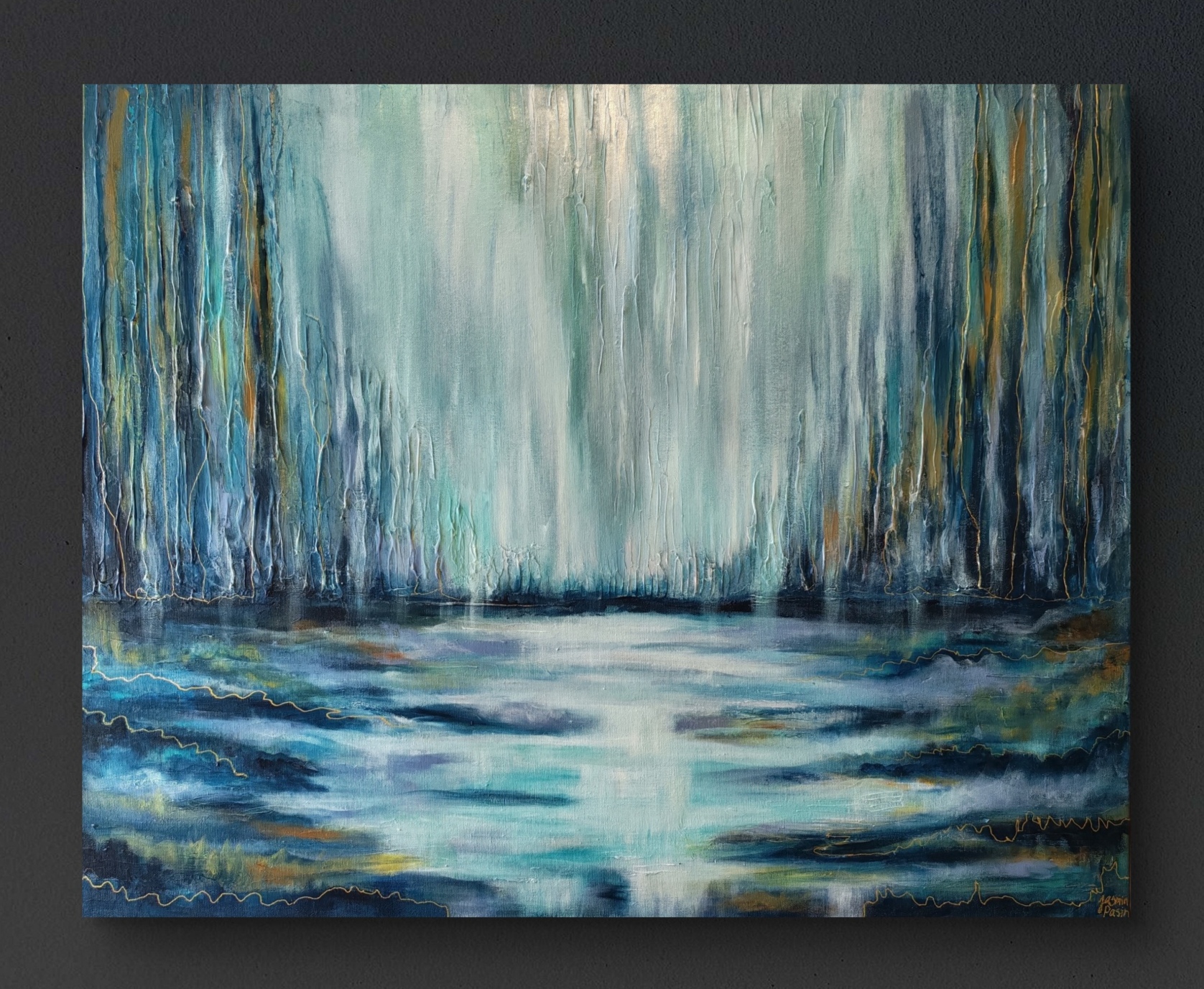 Source of life-teoksessa on kerroksellinen tekstuuri pinta ja rauhoittava värimaailma – sinisen, turkoosin ja utuisen valon sävyt sekä vaaleaa ja turkoosia helmiäistä. Okran ja kullan yksityiskohdat. Teos sopii tilaan, mihin kaivataan veden pysäyttävää rauhoittavaa ominaisuutta.
