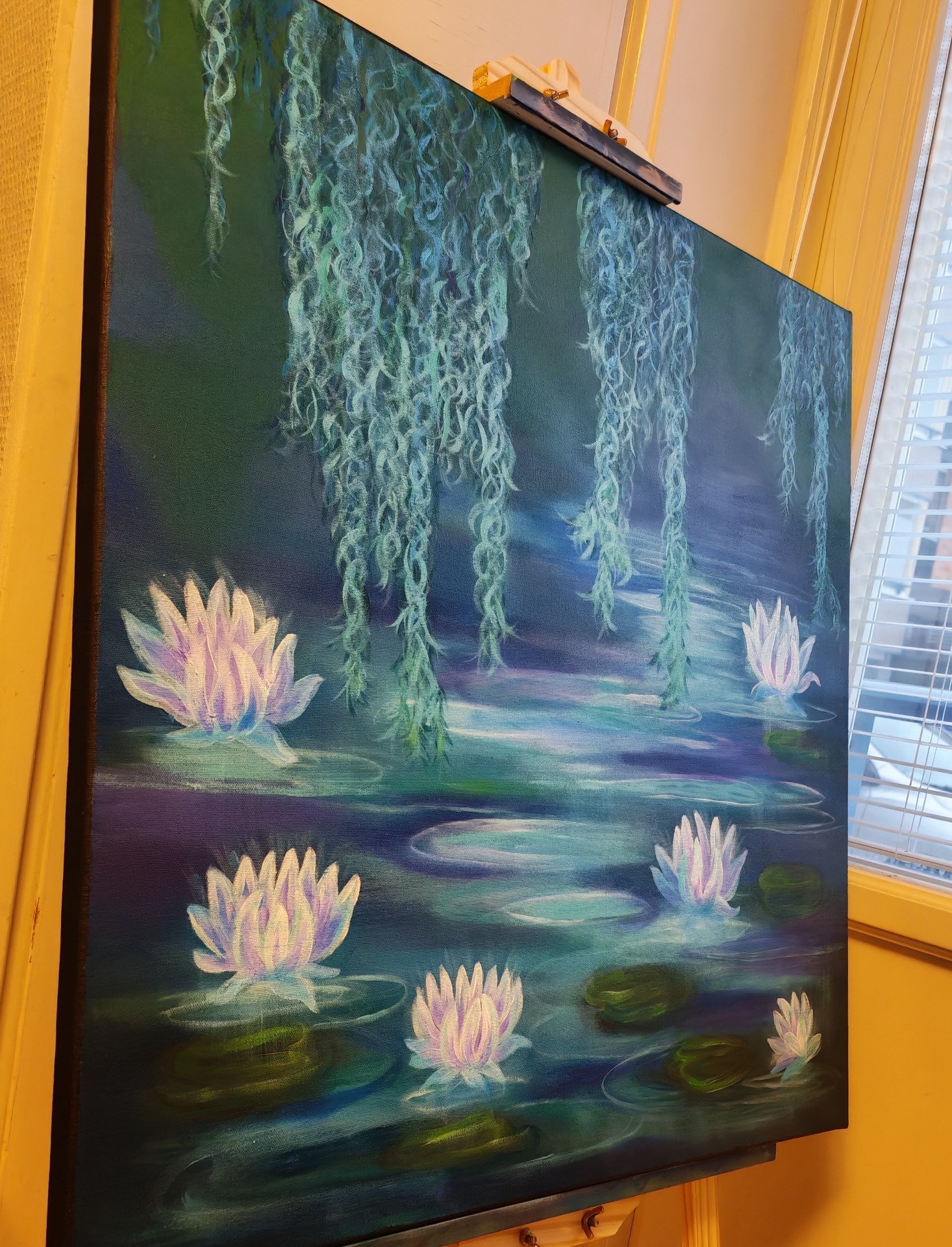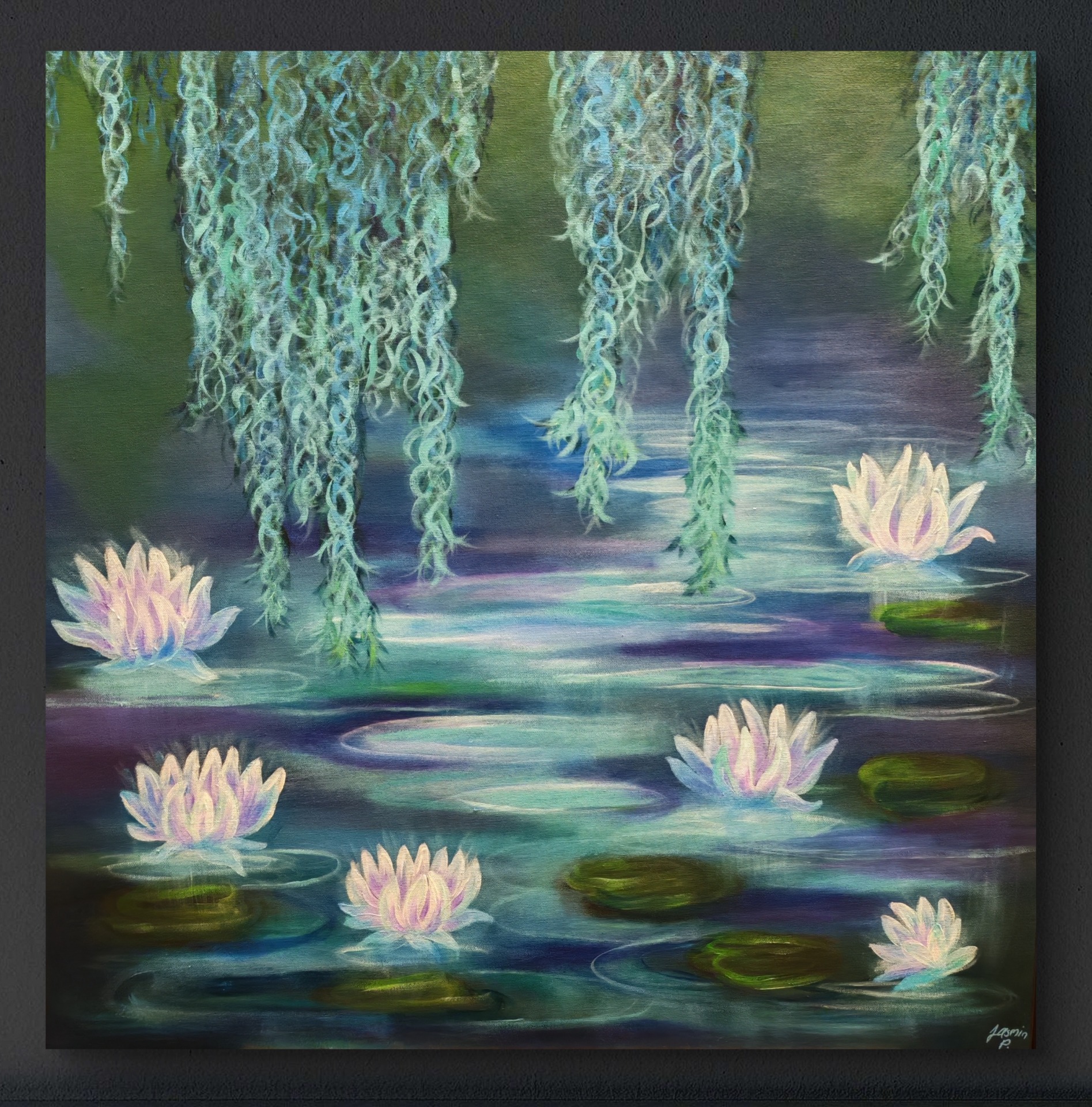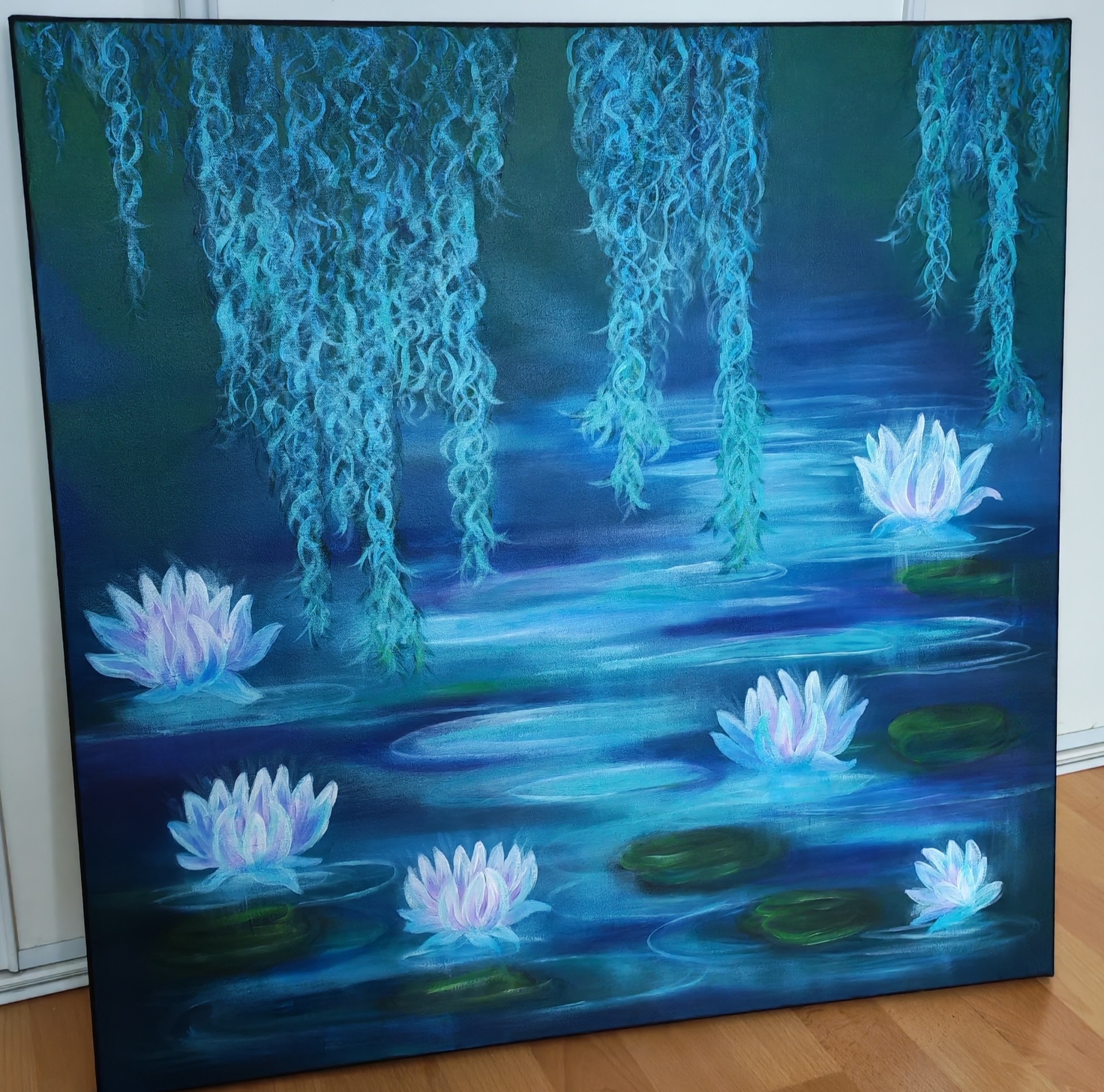 Sininen, kuunvalo ja lootus muodostavat yhdessä kolmen elementin kokonaisuuden, joka rauhoittaa tuutulaulun tavoin. Ne resonoivat sekä luonnon että mielikuvituksen tasolla, ja siksi niitä käytetään usein taiteessa luomaan rauhaa, mystiikkaa ja henkistä syvyyttä. Teoksessa on sinisen, violetin ja vihreän sävyjä. Teos säihkyy eri värisenä valaistuksesta riippuen!